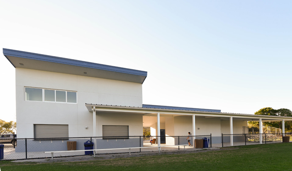 The existing soccer building required selective demo to make way for new renovations and a new structure built to house a concession area. The renovated building houses restrooms, offices and meeting space. A covered breezeway ties the 2 structures together and a large pre-engineered aluminum canopy covers the seating and patio area.